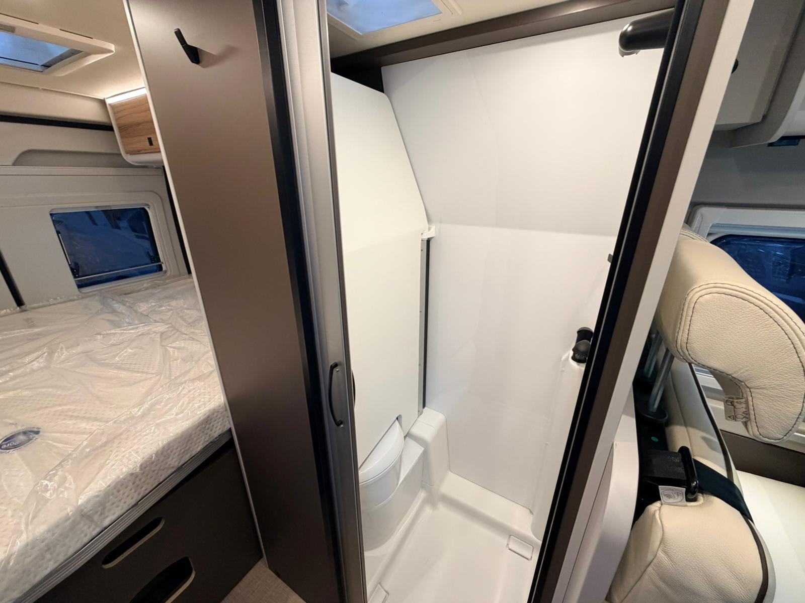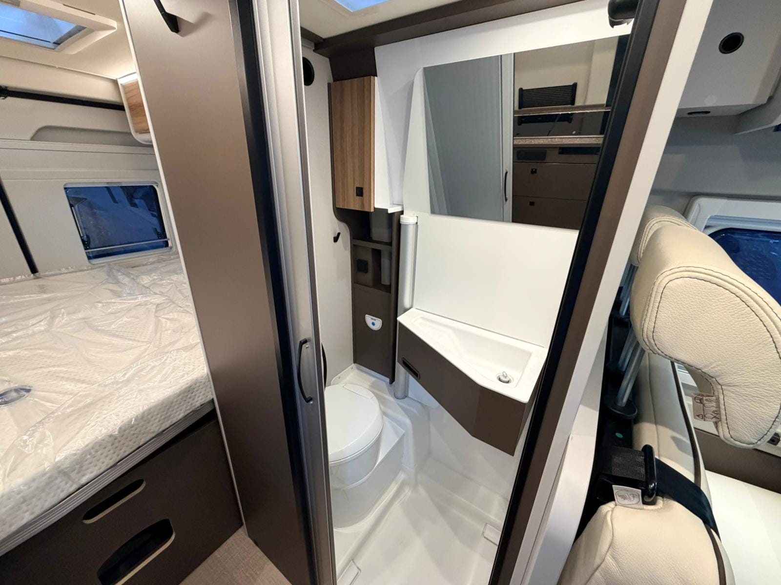 El baño tipo compacto incorpora WC cassette, lavabo y ducha, con soluciones inteligentes para aprovechar cada centímetro. Ideal para mantener autonomía total sin depender de instalaciones externas.