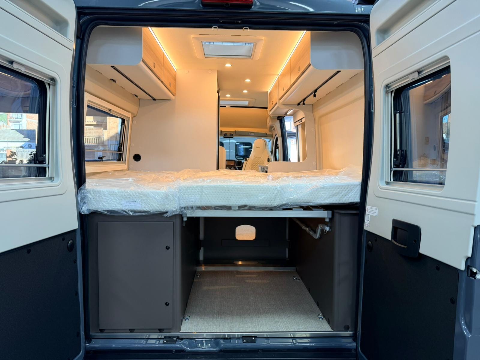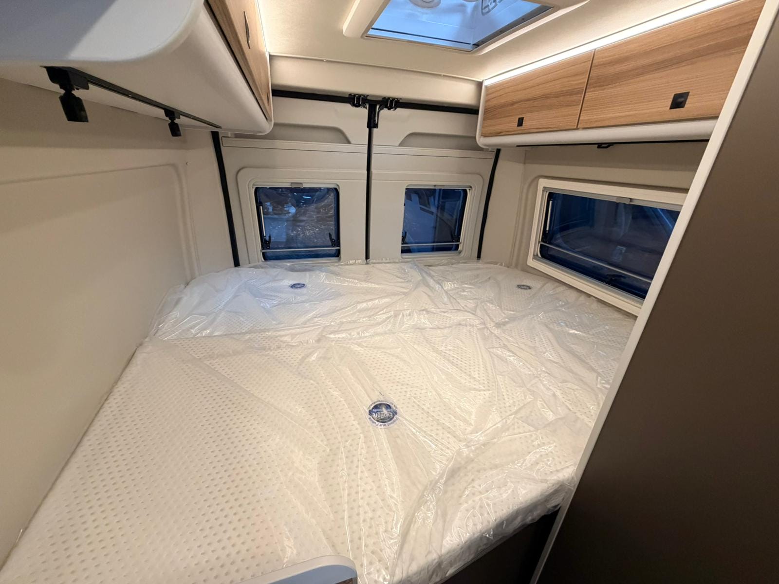 La zona de noche ofrece una cama confortable, diseñada para un descanso reparador tras cada jornada de viaje. Los materiales y colchones están pensados para un uso intensivo, manteniendo comodidad y durabilidad.