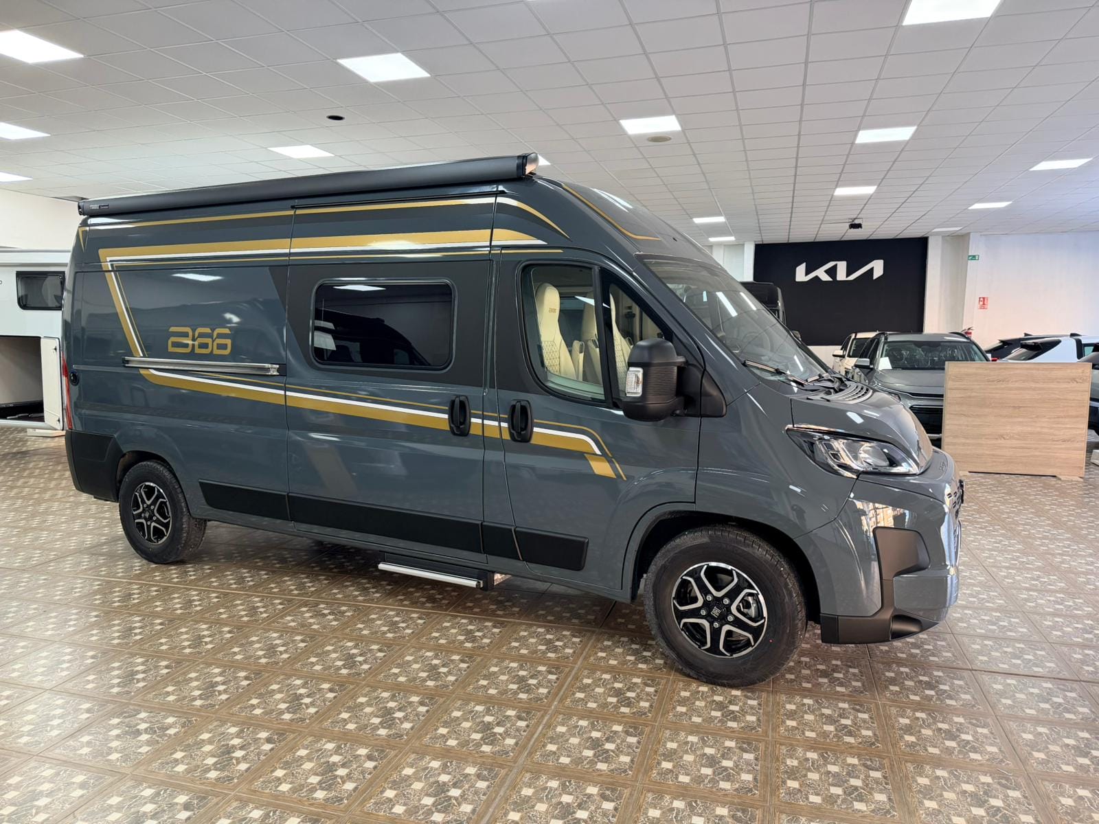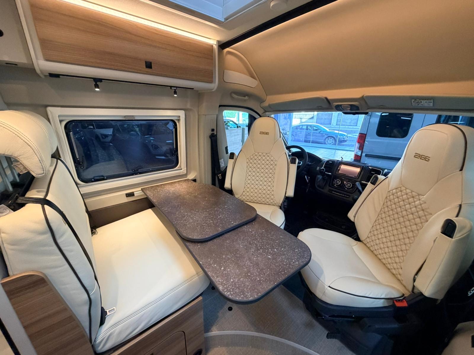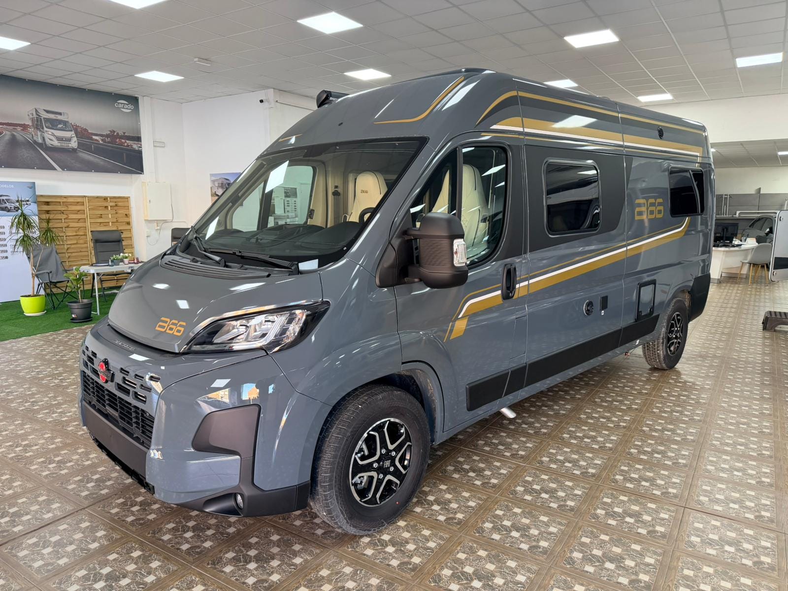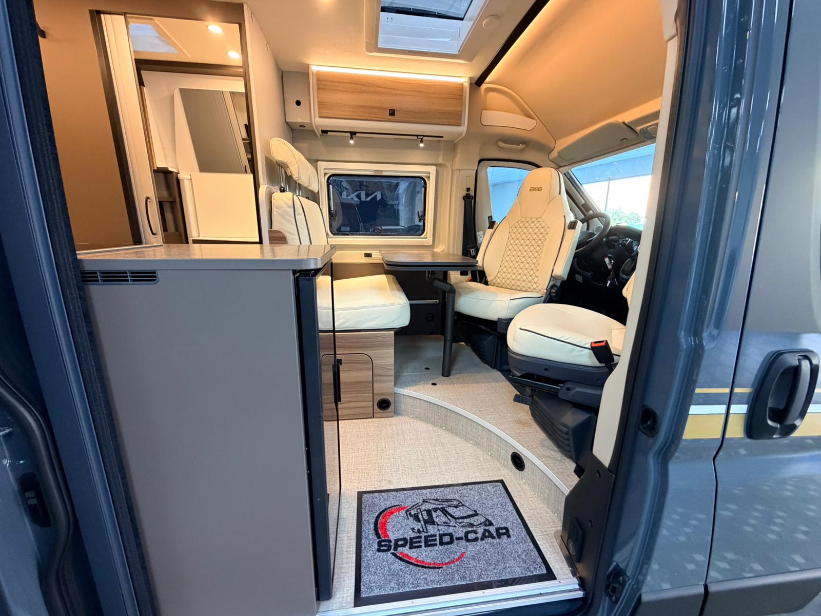 Gracias a su formato camper, la B66 600 C destaca por su gran maniobrabilidad y facilidad de conducción. El interior está optimizado para ofrecer una zona de estar acogedora, con asientos delanteros giratorios y una mesa funcional que permite comer, descansar o planificar la ruta cómodamente, incluso en espacios reducidos