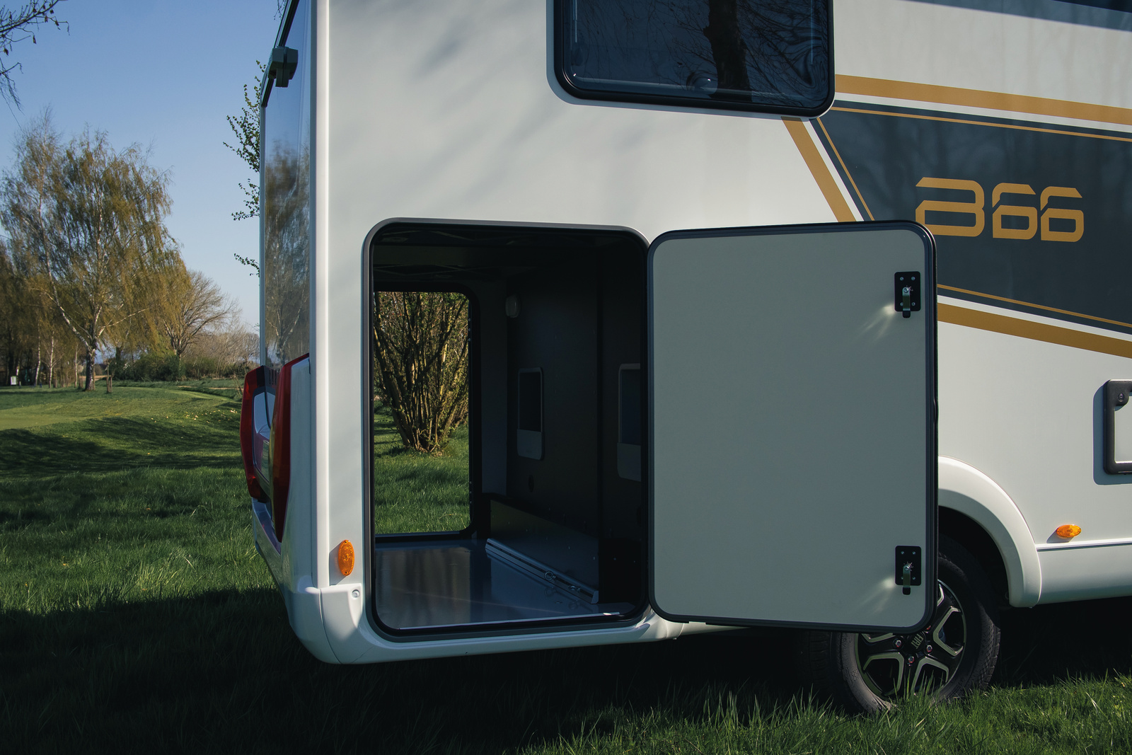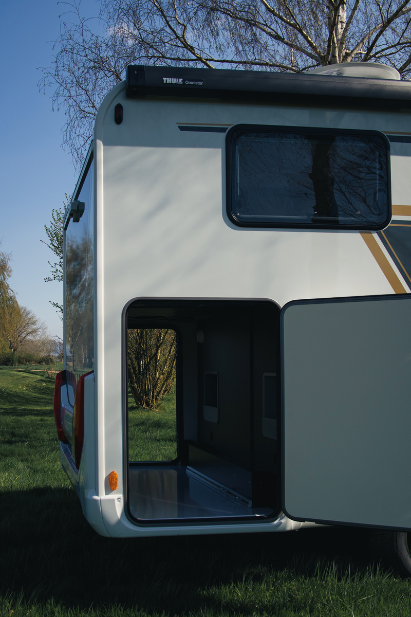 En la parte trasera se encuentran camas individuales que pueden convertirse en cama doble, con colchones de confort de múltiples zonas. Además, cuenta con suelo térmico (“Thermo-Floor”) para mayor confort.